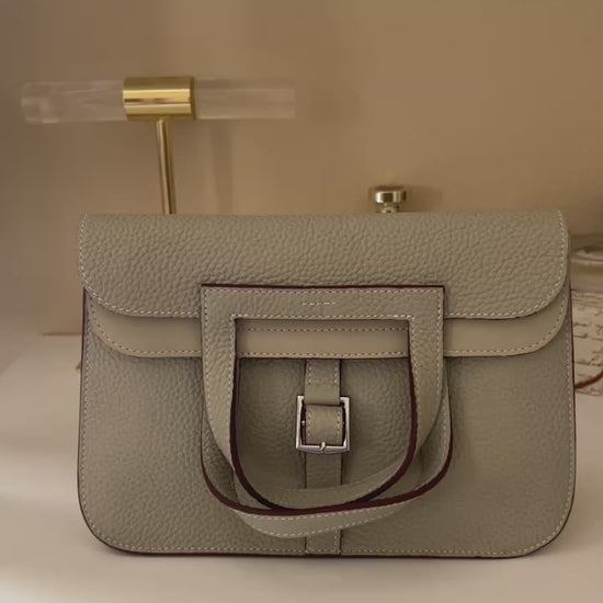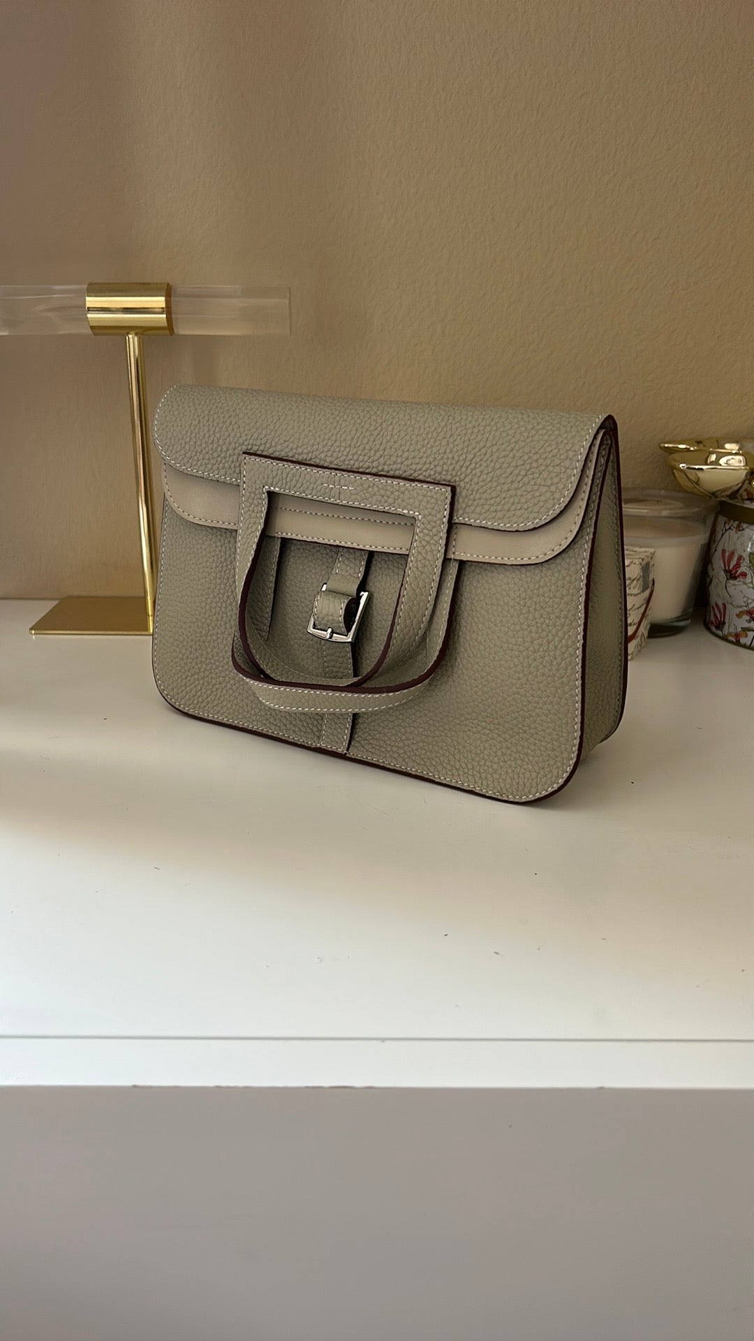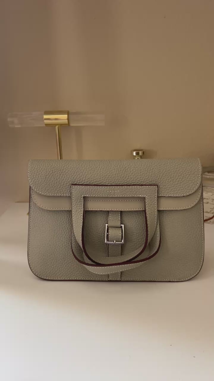 Full grained pebbled leather in gray, contrasting with lighter gray interior. White wax thread stitches.