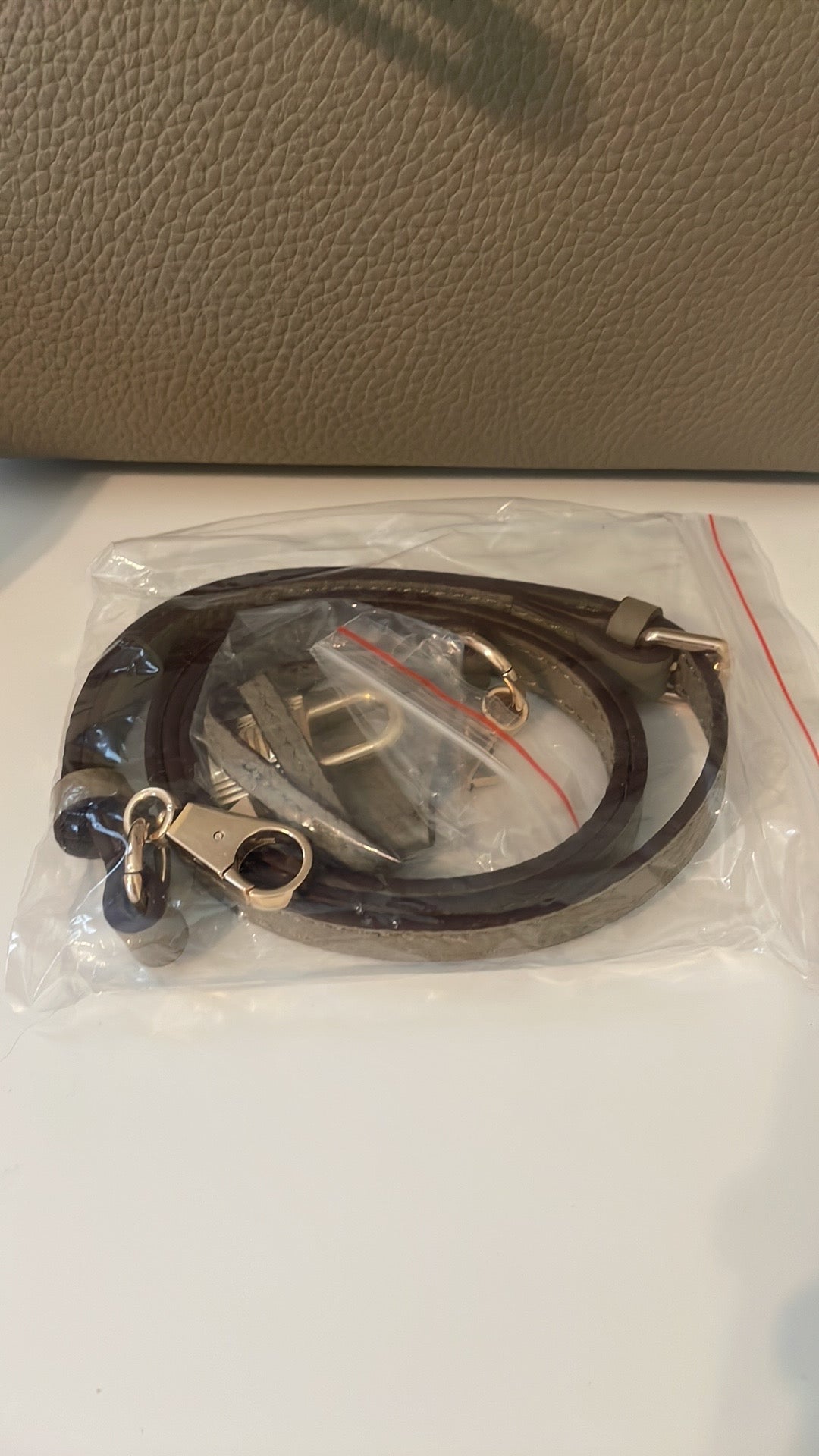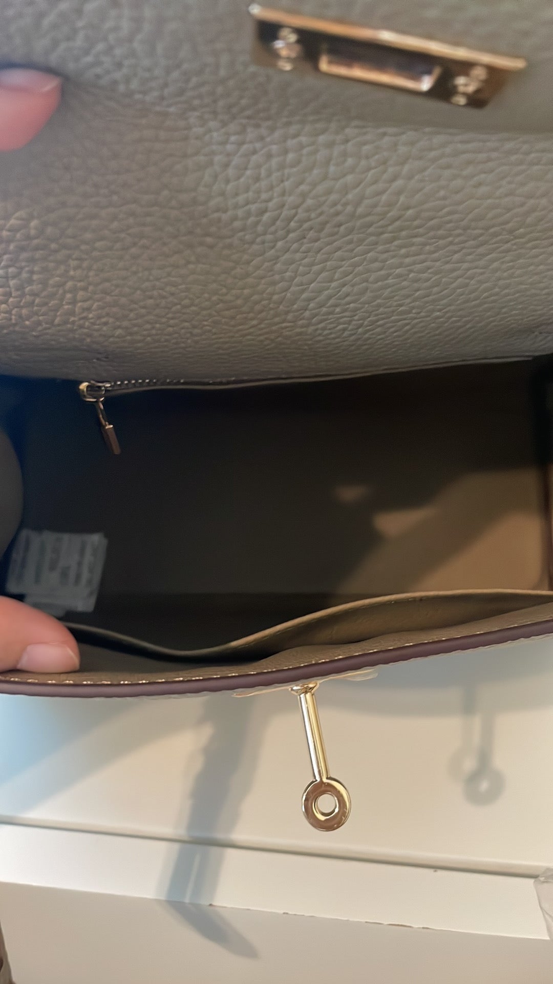 Full grain pebbled leather outer in gray with gold toned hardware.