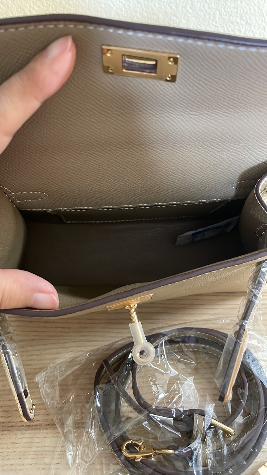 Classic belted design satchel in Taupe with gold toned hardware. Embossed calfskin leather that’s structured, durable and scatch resistant. Comes with a leather strap for shoulder carry. Brand new with protective covers.