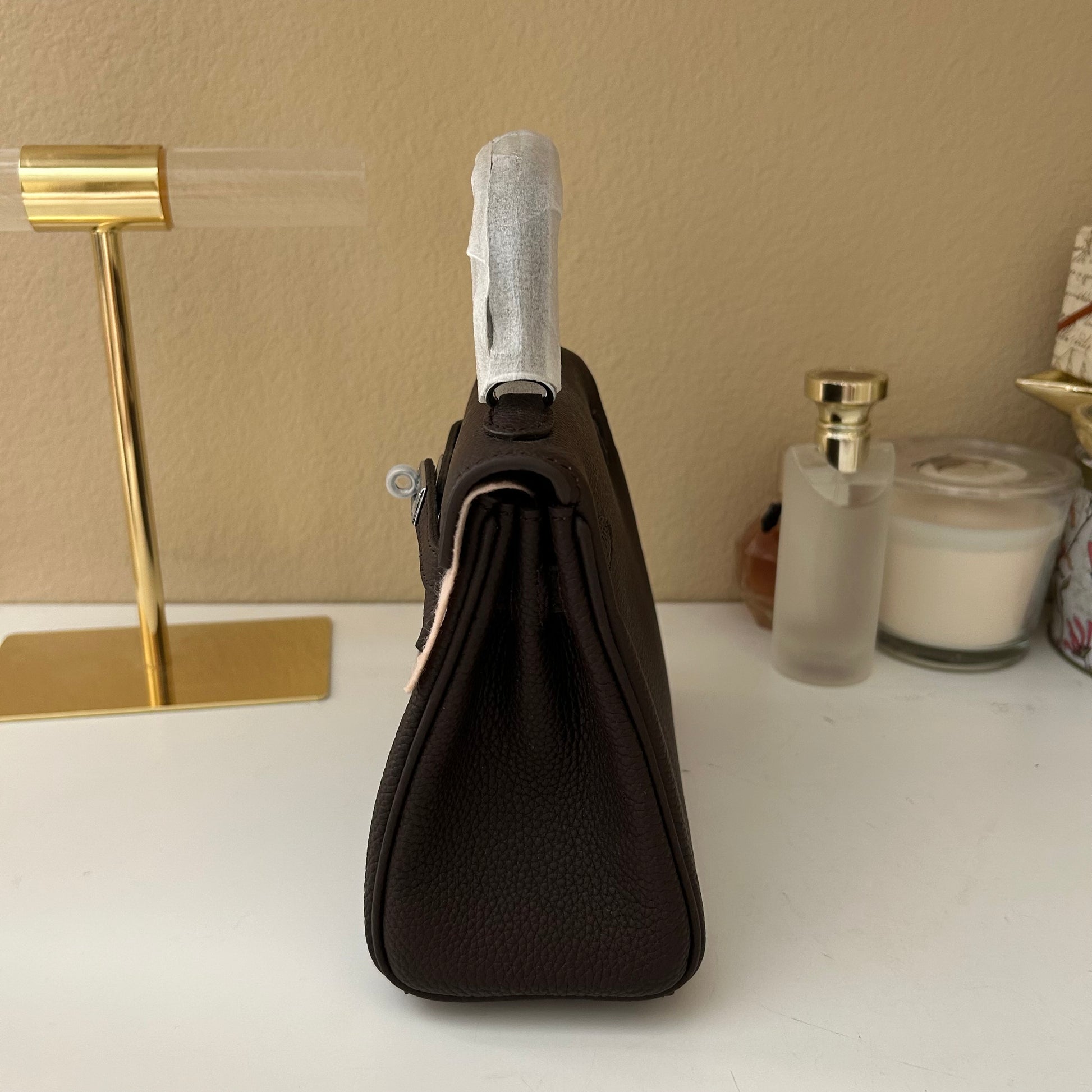 Full grain leather outer in Ebene with contrasting orange interior. Silver toned hardware. Leather is soft and thick.